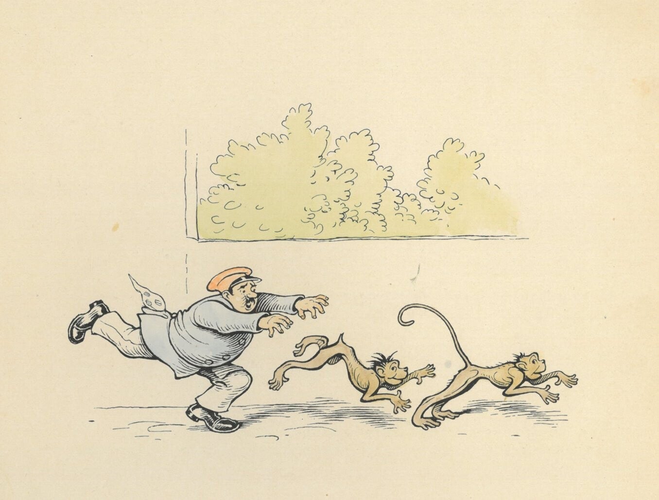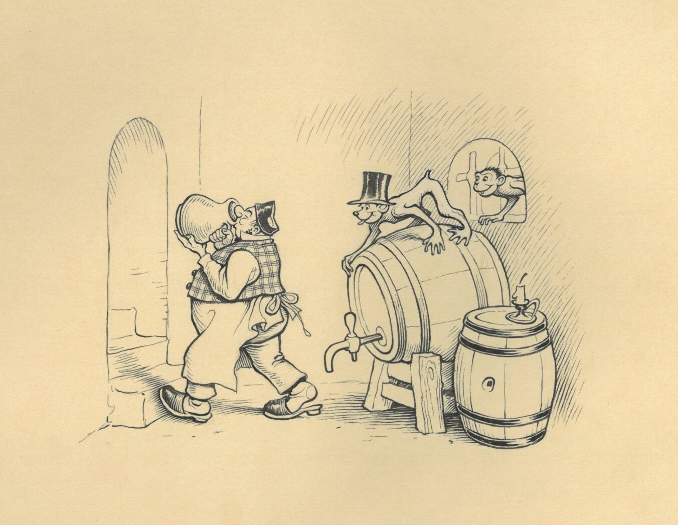 Levering naar Duitsland: 7,00 € extra. Klik op de afbeeldingen en bekijk ze groter. let vooral op de details en de expressie die de figuren uitstralen. Originele product omschrijving; Originalentwürfe und Vorlagen für das Bilderbuch "Fips und Jokko oder die durchgebrannten Affen", mit Versen von Hans Probst.
